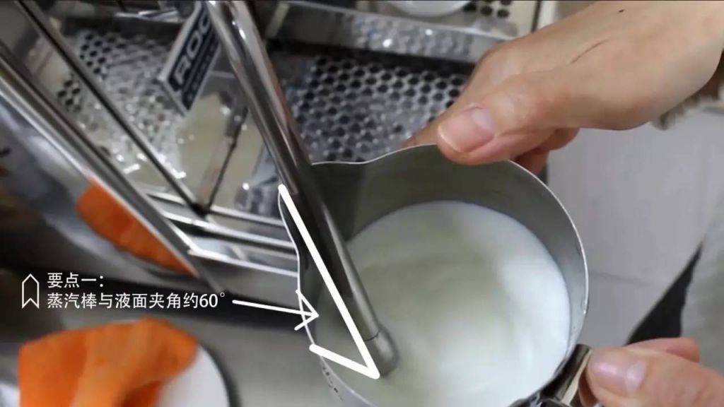 除了擺放正確的蒸汽棒位置,蒸汽棒與液面的角度也非常重要。蒸汽棒過(guò)于垂直,大部分蒸汽都向下噴出,難以讓牛奶形成小漩渦;蒸汽棒過(guò)于平,大部分蒸汽又會(huì)向平行方向噴出,讓小漩渦太大形成亂流導(dǎo)致難以控制或者牛奶溢出。
