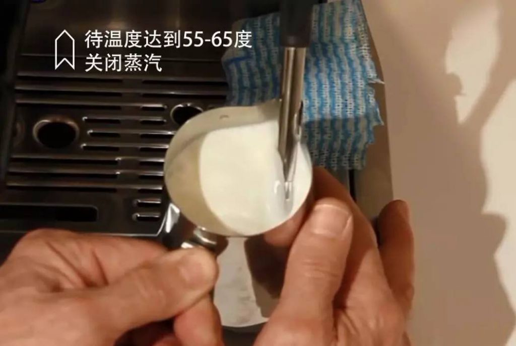 待發(fā)泡量足夠之后,我們稍稍抬高奶缸,將蒸汽棒更深的插入牛奶當(dāng)中,使其停止發(fā)泡,待溫度達(dá)到55-65℃左右(手掌開始覺得燙的溫度)關(guān)閉蒸汽,一缸綿密的奶泡就打發(fā)完成了!