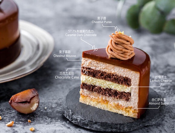 香甜的栗子慕斯與可可濃烈的香氣碰撞,檸檬飄香浸潤(rùn)舌尖。一切細(xì)滑松軟直達(dá)底部,“咔嚓”一聲的酥脆口感來(lái)自鋪滿杏仁的薩布雷,飽滿香脆的堅(jiān)果給予了最樸實(shí)的味蕾熨帖。