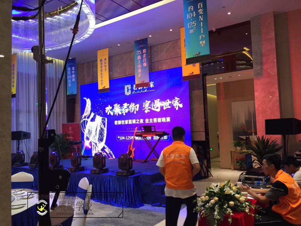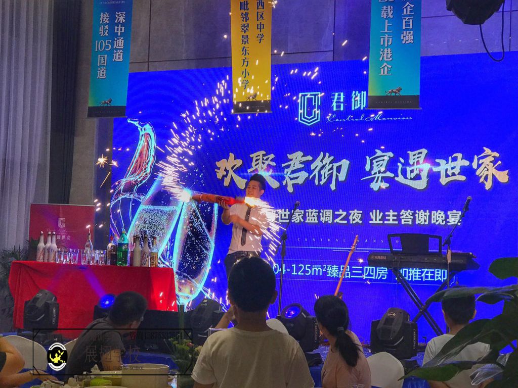 2018年7月3日,“君御世家藍調之夜•業主答謝晚宴”在廣州圓滿舉行。在這燈光璀璨、夢幻迷離的藍調之夜,在眾心歡騰,交談甚快的時刻,佛山展翅咖啡調酒西點培訓學校的調酒師學員受邀為全場表演花式調酒,花式調酒讓晚宴大放異彩,整個晚宴澎湃的熱情瞬間為之點燃!