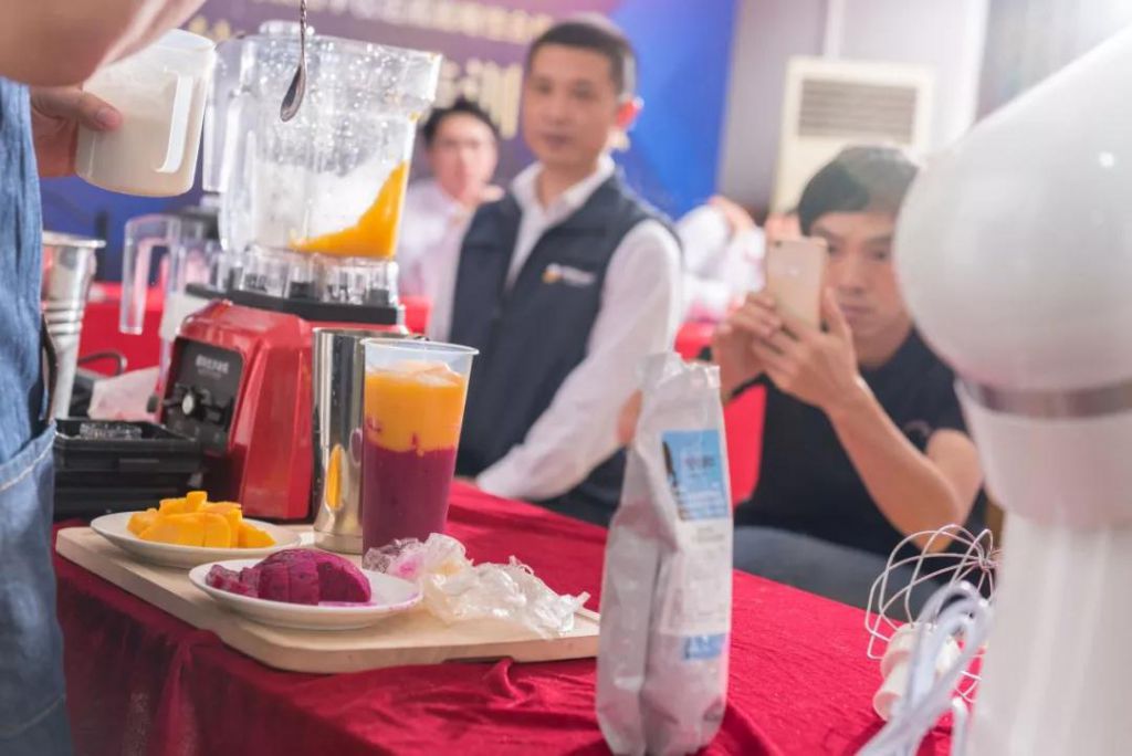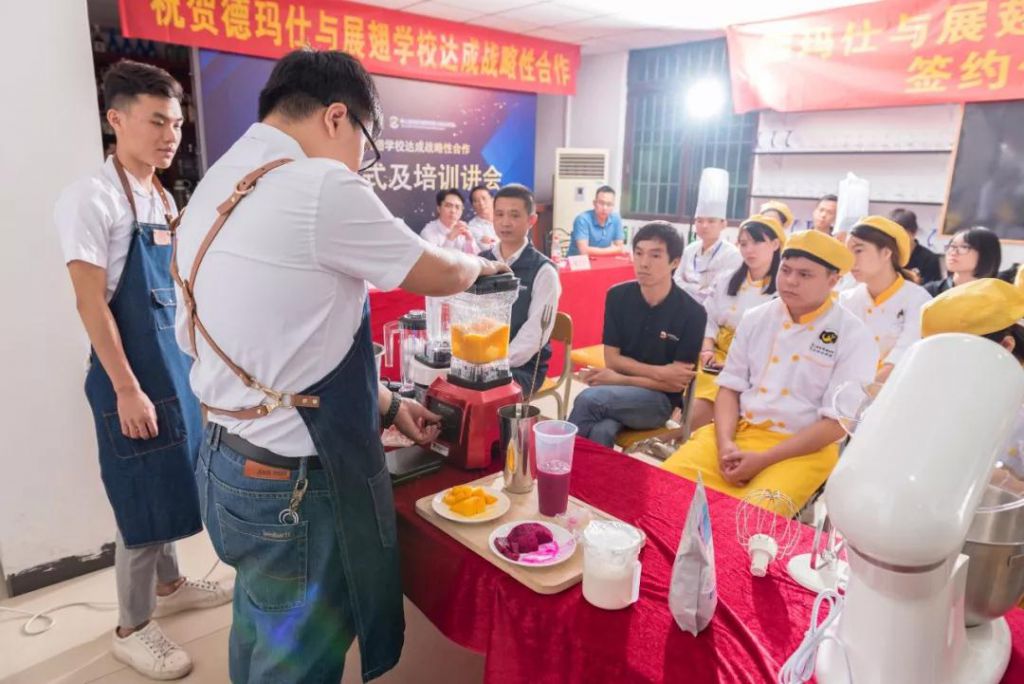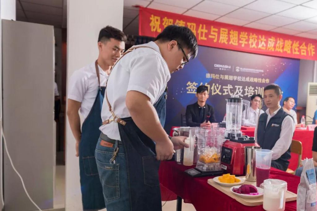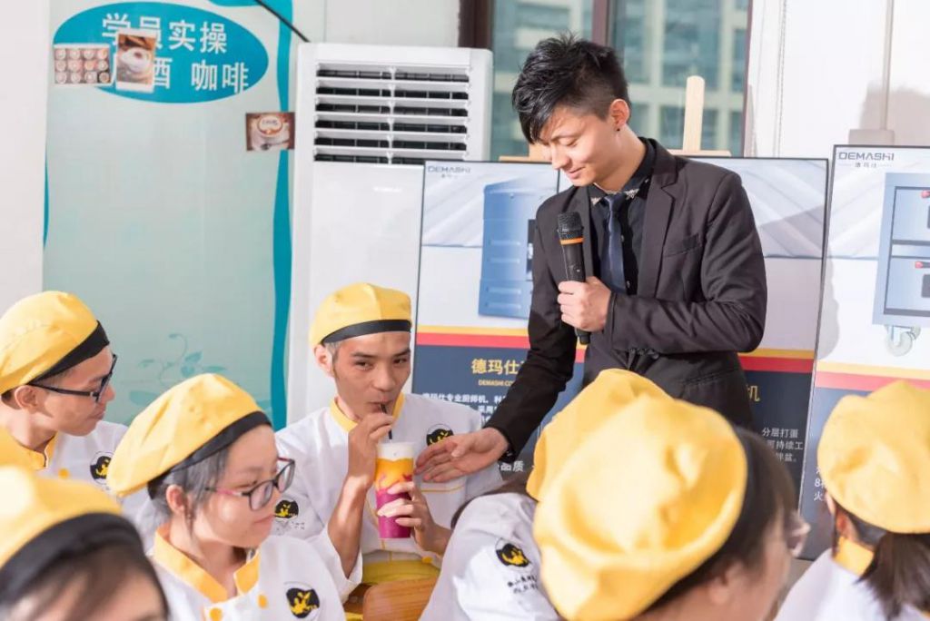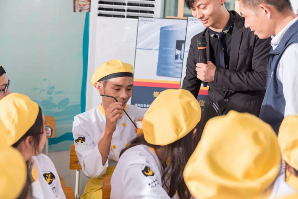 講會上,展翅學院的兩位咖啡導師蔡老師和林老師聯合上陣,現場示范使用德瑪仕生產的碎冰機等茶飲設備制作茶飲,德瑪仕設備的質量得到全場肯定,兩位導師嫻熟的茶飲制作水平也讓全場驚嘆!