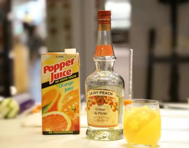“ 調制方法:在杯中放入適量冰塊,倒入45ml樂加桃子利口酒及適量橙汁,用柚子皮裝飾即可。