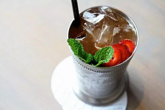 制作方法: 將黃瓜和蜂蜜加入雪克壺中攪拌,隨后加入芒果泥和青檸汁,加冰搖晃后過濾倒入容器,將干姜水從頂部倒入并攪拌。