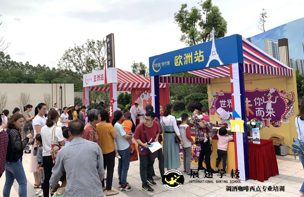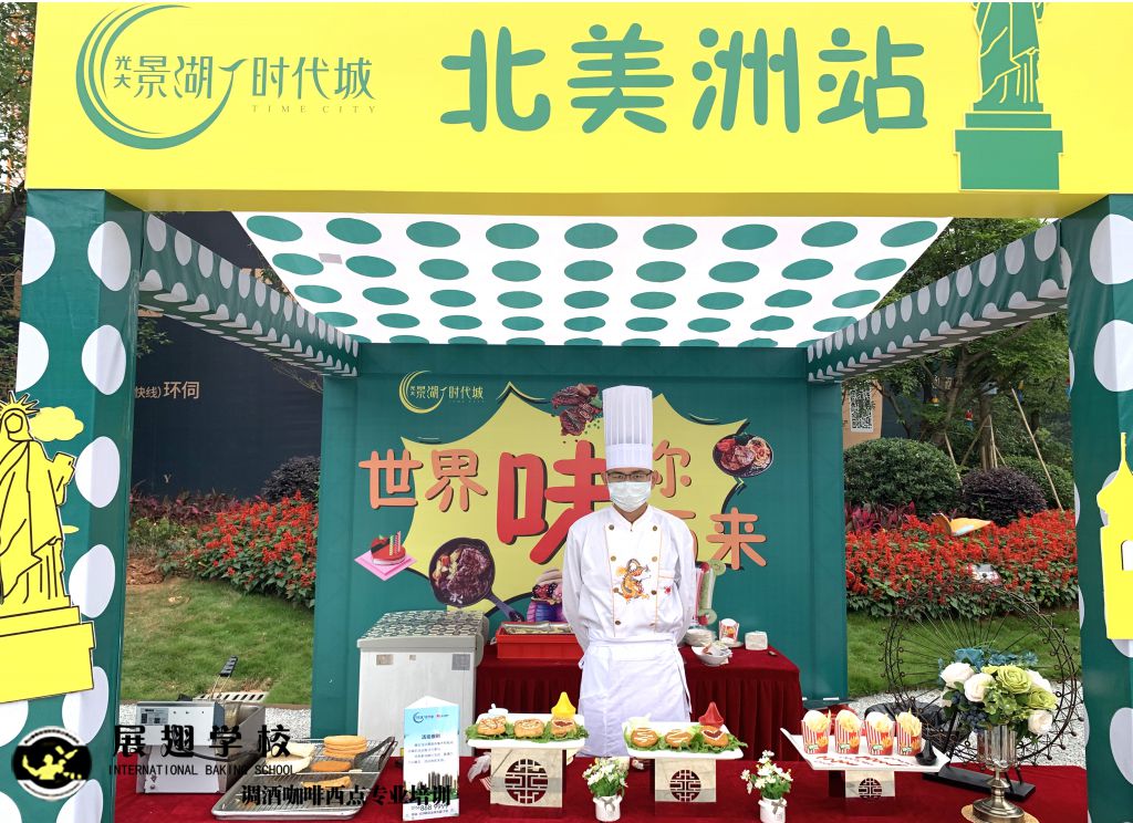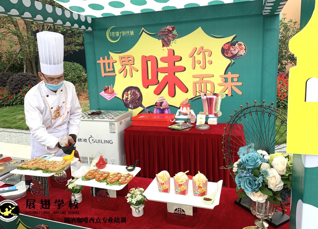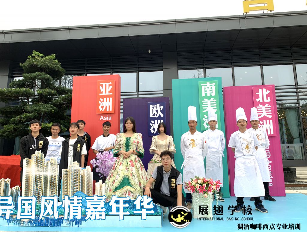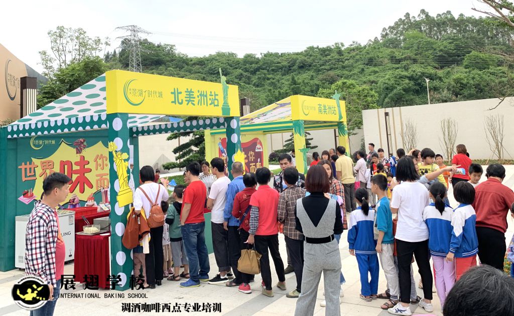 光大地產-云浮景湖時代城 五一異國風情嘉年華展翅調酒咖啡西點培訓學校學員糕點戶外實踐,這樣可以檢驗學員這段時間以來的學習成果,還能讓學員親自體驗下西點服務行業的工作,還能提升自己的技術和能力。