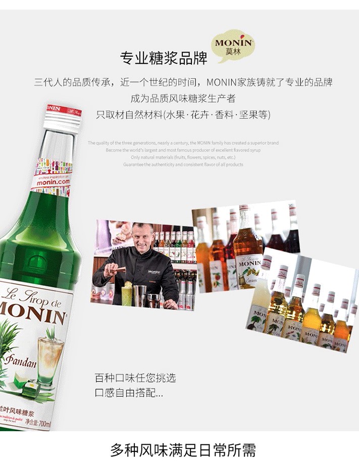 1912 年,Georges MONIN在法國創(chuàng)立了以家族名字命名的品牌與第一家工廠,專注生產(chǎn)優(yōu)質(zhì)利口酒與糖漿。因他對待品質(zhì)的熱誠與執(zhí)著讓產(chǎn)品脫穎而出,讓MONIN成為優(yōu)質(zhì)產(chǎn)品的代名詞,現(xiàn)已是世界上著名的風味糖漿生產(chǎn)者。近年來,MONIN堅持不斷創(chuàng)新,嚴打新風味與應用方式,致力于傳遞完美餐飲體驗,引領飲品多元化發(fā)展,為餐飲企業(yè)提供完美解決方案!