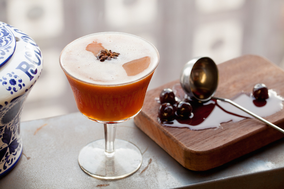 Add all ingredients to a mixing tin and dry shake; add ice and shake again; double strain into a chilled coupe. Garnish with star anise.